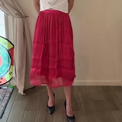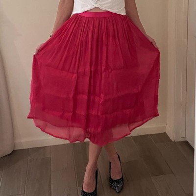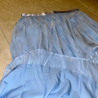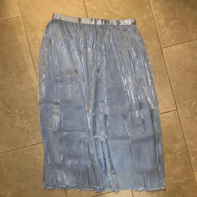 [This review was collected as part of a promotion.] This pleated skirt fit nicely and as expected as an XL. The elastic waistline nicely adjusts to my waist. The color is very pretty and the shimmer is subtle. It’s lightweight and has a second layer slip underneath so it’s not see through. It does not have pockets or a zipper. I think it’ll be easy to dress up or dress down. The price is a bit higher for the simple quality.