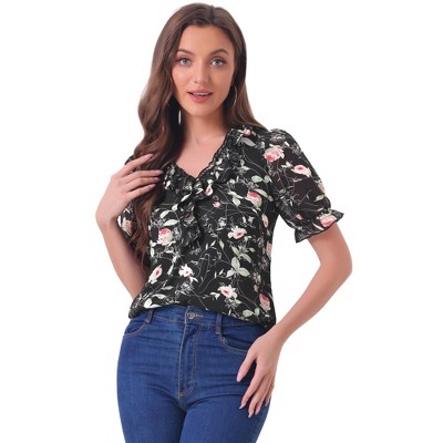 Crafted with soft and stretchy material, and printed with cute ditsy floral patterns, this chiffon top is perfect for ladies, teens, and girls. This pretty floral blouse has a relaxed-fit silhouette and flounces at the front, which highlights your charm. A ruffled frill neck and ruffle short sleeves with elastic cuffs would give an elegant and fashionable style. Perfectly paired with any pants or jeans for a casual look.