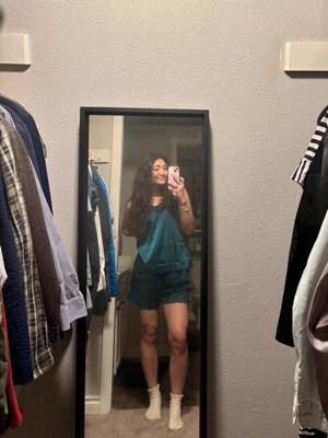 [This review was collected as part of a promotion.] I absolutely love these pjs. The color looks like a beautiful teal in person. I love the length and coverage with the shorts. The lace is cute but the pjs still feel appropriate. They're very comfy and the satiny material has some stretch to them. The spaghetti straps are adjustable.