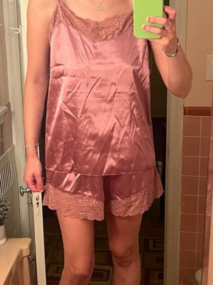 [This review was collected as part of a promotion.] This set is a nice cute and comfortable pajama set. The lace is soft and not itchy at all which is important to me and the satin material is nice. I feel like it runs a little big, but the top does have adjustable straps which is a plus.