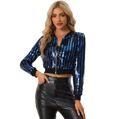 INSPIRE CHIC Women's Sequin Sparkle Front Zipper Cropped Bomber Jacket