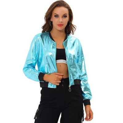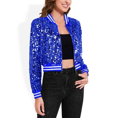 INSPIRE CHIC Women's Party Sequin Sparkle Long Sleeve Cropped Length Zipper Bomber Jacket
