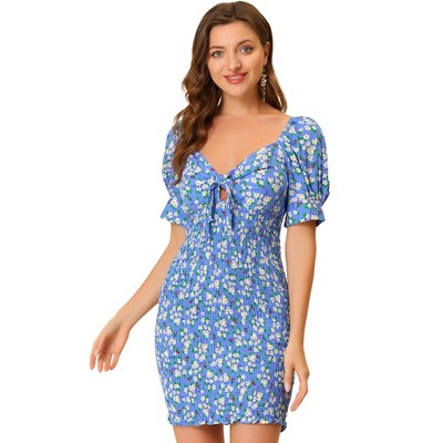 Allegra K Women's Smocked Square Neck Long Sleeve Floral Dress Dark Blue Medium