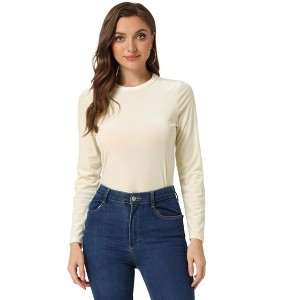 INSPIRE CHIC Women's Solid Round Neck Stretchy Long Sleeve Velvet Blouse - 1 of 4