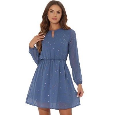 Allegra K Women's Square Neck Metallic Stars Ruffle A-Line Stretch Waist Midi Dress Dark Blue X-Small