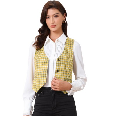 • This v-neck plaid vest is closed with a single row of buttons and it is cinched waist, the overall design is simple and stylish