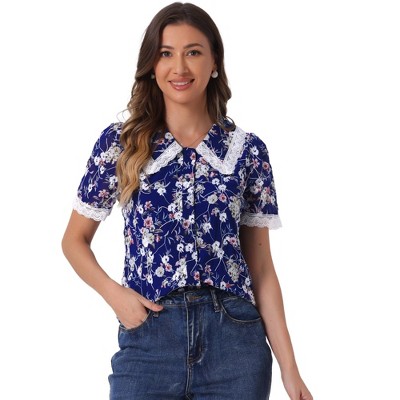 Allegra K Women's Summer Floral Chiffon Tie V Neck Ruffled Short Sleeve Shirt Medium Blue