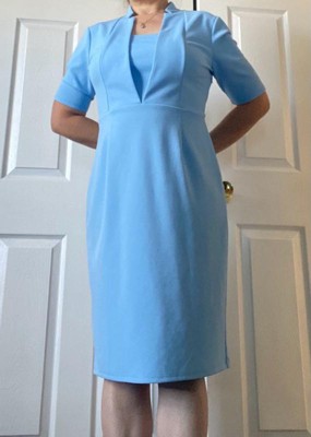 [This review was collected as part of a promotion.] This dress fits like a glove. The material is breathable and stretchy. This would be a great dress for the office it’s formal and stylish. Mine was in a gorgeous light blue color. I got mine in a large and I’m like a size 10