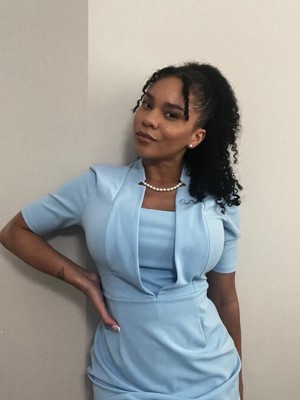 [This review was collected as part of a promotion.] I love the baby blue color of this bodycon dress. The material is very stretchy and comfortable, so it’s perfect for long work days. The only complaint I have is that it runs big. Other than that, it’s a cute dress to wear to work.