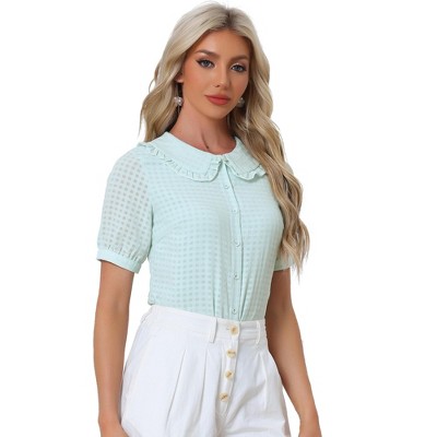 This retro blouse features classic puff sleeves. It is a perfect option for weekdays and weekends in the sun. Featuring a cute Peter Pan collar and contrast design, the top is completed with short sleeves. Modern formal wear meets vintage femininity on this cute shirt, which has a doll collar design and pintuck at the front. It is perfect to style with jeans and high heels for a sweet look.