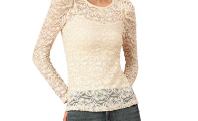 Add some romance to your look with this sheer lace top. The slightly stretchy fabric creates a breezy, textural base for this lace top, which is accented with long sleeves for a feminine dimension. A cami top should be worn, which is not included in this garment. This sheer top has a feminine design of floral lace and long puff sleeves. A semi-sheer top features an all-over floral lace design, a round neck, and long sleeves. Great for simple but trendy pants or skirts.