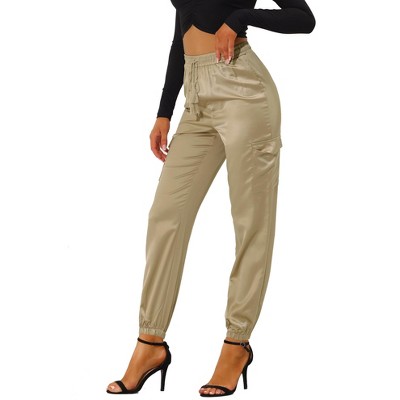 INSPIRE CHIC Women's Vintage Tartan Plaid Elastic Waist Straight Long Trousers Pants Small Light Beige
