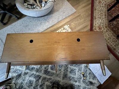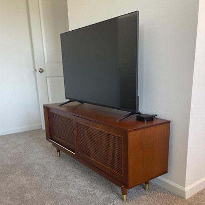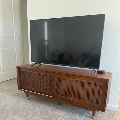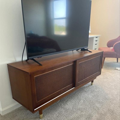 This Mid-Century stylish Allen TV Stand from angelo:HOME brings modern flair to your living space. Finished in a rich walnut, this cabinet features two sliding doors accentuated with woven rattan door fronts. Inside you will find a large adjustable shelf that provides storage space for your electrical devices. Solid rubberwood legs with a slight tapered design are artfully capped with brass-tone brackets. Constructed of durable particleboard with birch veneer, this stand accommodates up to 60” TV’s.