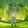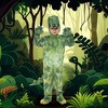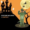 - INCLUDES: Fully printed jumpsuit with attached shoe covers, mitts, and hood with decorative rubber teeth, beaded eyes, and Velcro strap closure.