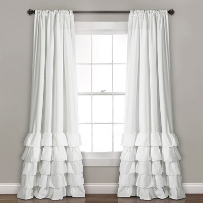 - Feminine, delicate style curtains with ruffles layered on the bottom of each panel.