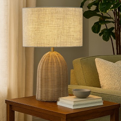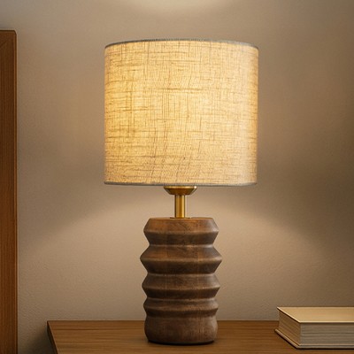 ALOADECOR 28'' Farmhouse Honey Brown Wood Bedside Table Lamp – Classic Drum Shape Nightstand Lamp with Beige Fabric Shade for Bedroom, Living Room