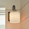 - This wall sconce features a U-shaped matte black arm paired with brushed brass accents, the cylindrical opal white glass shade gently diffuses light, creating a warm and inviting glow