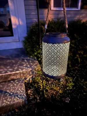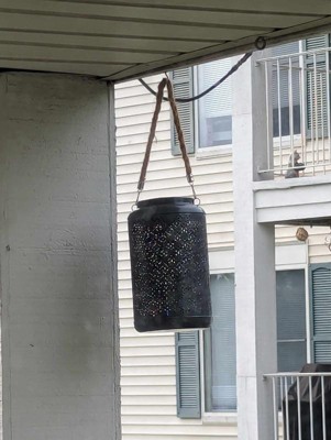 [This review was collected as part of a promotion.] Beautiful hanging lantern. Super durable and has stayed hanging strong during thunderstorm and high wind on my porch. Pretty design which shows the light through the pattern unto my porch. Long lasting battery through solar panel so the sun recharges it.