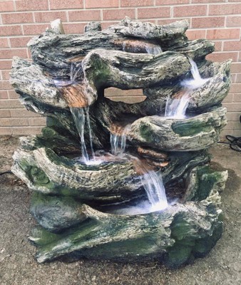 Relax to the sounds of nature with the Alpine Corporation 32"" tall Outdoor Multi-Tier Rainforest Rock Waterfall Fountain with LED Lights. This cascading rainforest waterfall floor fountain provides a tranquil and soothing addition to your porch, backyard, or lawn. Constructed from durable polystone and fiberglass with a natural look and realistic textures, the fountain is weatherproof, rust-resistant, and resilient. This lawn statue will bring a touch of natural beauty to your outdoor space. Replicating natural wood and stone formations, the fountain becomes illuminated with the included white LED lights. The beautifully crafted wood and stone looking fountain imitates the natural drips heard in a forest after the rain. Relax to the sounds of the natural water flow as it cascades down from the top tier of the fountain through the tiers of stones. Not only will the fountain provide you with serenity, it will also attract birds to your outdoor area, which in turn promotes healthy gardens. This floor fountain provides an elegant addition to your courtyard, patio, or yard, and gives your garden visual interest with its natural waterfall style. For quick install and convenient operating, the fountain includes all necessary parts, as well as a pump, to begin creating an outdoor oasis. This standing fountain measures 32"L x 25"W x 32"H and includes a one-year manufacturer's warranty from date of purchase.
