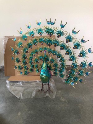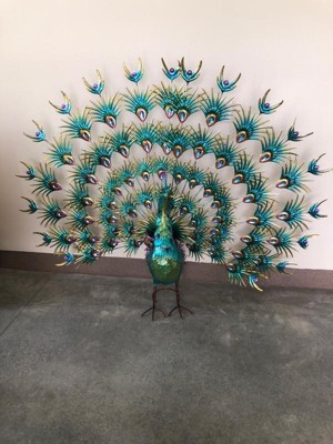 [This review was collected as part of a promotion.] This is a beautiful peacock. The bird itself stands 35 inches total height is 55 inches. Its 68 inches in width. Really nice and easy to assemble. Everyone loves it. Great eye catching. The glass jewels in feathers are nice.