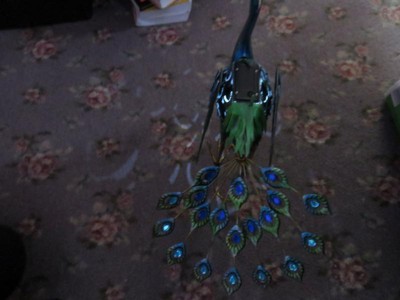 [This review was collected as part of a promotion.] This peacock is pretty. It does look a little different than the picture. My plumage spread seems smaller and the bird seems a darker color and more metallic. It is only about 2 feet tall.