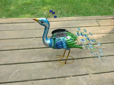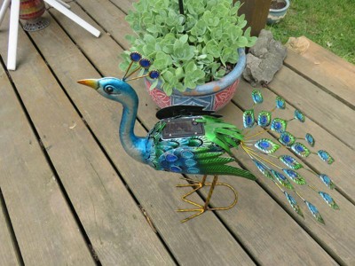 [This review was collected as part of a promotion.] I really like this metal peacock sculpture. We usually do up our deck every summer with flowers, rocks, crystals, etc, and this shiny fellow fits right in. He's the perfect size for us; I love the colors, and the 'gems' add a nice, sparkly touch. As far as the LED goes, it does work as described, but the bulb is so tiny, and being inside the bird, you can't see much light. However, it does throw some really cool looking shadows, so maybe that was the actual intent. In any case, whether lit or not, he looks really cool.