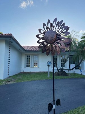 [This review was collected as part of a promotion.] Bronze Sunflower Kinetic Wind Spinner Stake is a nice addition to my outdoor garden area. It’s a coppery bronze color with spinning heads that are a large flower design with stationary leaves farther down the stake and is a nice size- 85 inches tall. It was easy to assemble with no tools required, easy to put the stake in the ground with just a rubber mallet and has remained in place even through some heavy winds and rain. It spins well, both sides spinning independently of each other so it’s really interesting to watch. I’m very happy with the way this kinetic spinner looks and performs.