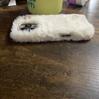 The case is really cute! It’s soft, fluffy and looks exactly as pictured. I added my favorite Hello Lux wristlet to the back two hooks for an elevated look. Good quality; and case must be removed in order to charge your phone.
