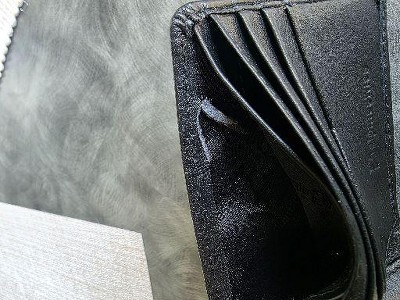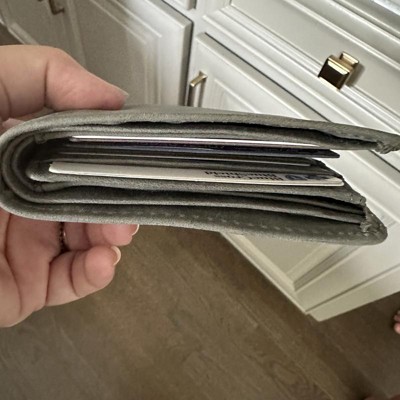 [This review was collected as part of a promotion.] I purchased this wallet for my husband. I believe it's Nubuck Black. Once you fill the card slots and add money or receipts, it gets bulky feeling for him. It seemed like it would be thinner. He only has 4 cards and a couple business cards. He's contemplating cutting out the flap to make it more thin, however, he really likes the 2 ID card slots on that flap. He is used to the simple metal wallet. He likes the feel of the wallet material. Nice packaging for gifts. Great color selection. I received an incentive to write this review.