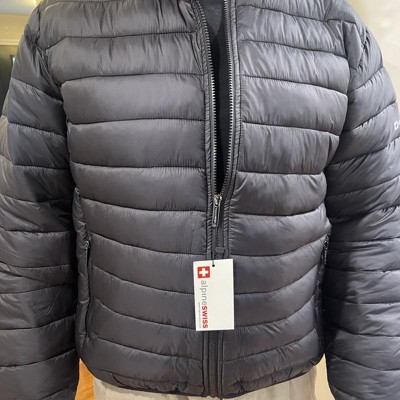 Niko Mens Puffer Jacket By Alpine Swiss Product Features: Shell: 100% Nylon, Fill and Lining: 100% polyester EXCEPTIONAL WARMTH & LIGHTWEIGHT COMFORT: Experience superior warmth without the bulk. This men's puffer jacket is crafted with a premium down alternative fill (100% polyester) and a durable 100% nylon shell, providing excellent insulation and comfort. It's an ideal choice for cold weather, offering reliable warmth and a cozy feel. STYLISH, FUNCTIONAL & WEATHER-READY: Designed for both style and performance, this jacket features a convenient front zipper closure, two secure zippered front pockets, and two interior slip pockets. Its water-resistant nylon shell and mild windproof design keep you dry and comfortable in cool or changing weather, ensuring protection against light rain and wind. VERSATILE LAYERING & MODERN FIT: This lightweight jacket is perfect for layering over t-shirts, sweaters, or button-downs, offering versatile style for various outfits. While it generally fits true to size, we recommend sizing up if you plan to wear thick layers underneath or prefer a more relaxed fit, ensuring optimal comfort and movement. ULTRA-PACKABLE & TRAVEL-FRIENDLY: Designed for ultimate convenience, this puffer coat easily folds into a compact size, making it perfect for storage in a suitcase, closet, or drawer. It's an essential travel companion, packing effortlessly without taking up much space, so you're always prepared for changing temperatures. DURABLE QUALITY & EASY CARE: Built with quality materials and finished with gunmetal-tone zippers engraved with the Alpine Swiss logo, this jacket is crafted for durability and long-lasting wear. It's also machine washable for hassle-free maintenance, ensuring it remains a reliable and stylish part of your winter wardrobe for seasons to come.
