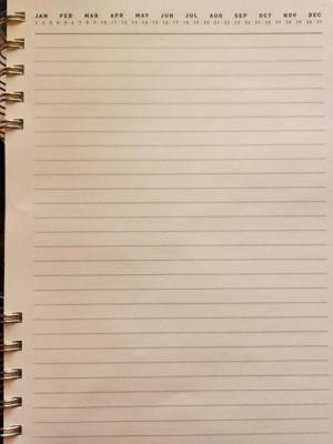 Great mid size notebook that really can be used for anything. It is made out of recycled materials. It has a little pocket in the front that could be used for receipts or other things. Each page has the months and days lined up on it so you could use as a daily journal or some sort.