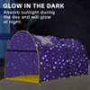 - Versatile usage: this bed curtains measures 58 x 35 x 40H inches for all twin beds. This bed tent provides a play area during the day and a fun sleep experience at night. Better Sleep during nap time, bedtime. Fun for playtime and alone time. Kids love this bed tent with imagination of an adventure under outdoor stars. Glow in the dark starlights are also comfort to kids who are afraid of the dark, they feel safe in their own fantasy world.