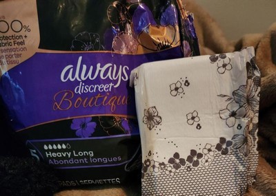 [This review was collected as part of a promotion.] I have been using discreet pads for over 6 yrs they never seemed pretty and now they are thanks to Always discreet Boutique with a pair of black underwear you could pretty much not see them that’s a plus for me …They are very thin and comfortable and that is also a plus as it is a 5 drop long …. They absorb well and no order with a pair of tight underwear it’s like not wearing nothing …. The only thing I might say I had a problem with is the back sticking to the bathroom seat so just make sure it’s secured to your undies when you get up if not you might get pulled back to a sitting position 🤣🤣 all in all a good pee pad and pretty☺️