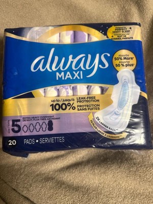 Always Maxi Overnight Pads provide you a PERFECT NIGHT SLEEP with 45% larger back vs Always Regular Maxi Pad for better coverage during the night. If you're looking for uncompromised period protection, you've come to the right place. Always Maxi Pads ABSORB 50% MORE vs. same size Always Ultra Thin Pad. Additionally, Always Maxi Pads also feature the Always 3X Protection System to give you up to 100% leak-free comfort, no matter how you sleep. Always Maxi Pads possess RapidDRY Technology, which works to wick away gushes fast to absorb more than you may need. Experience long lasting protection with leakGUARD technology that locks in leaks, and SecurelyFITS helps the pad stay in place throughout no matter what you do. Make sure that you are getting the right protection from your pad, as using the wrong pad size can lead to leaks. Whether you have a heavy flow or a light one, Always has you covered. Always Maxi Pads come in a range of sizes fit your flow and size perfectly depending on your needs. If you have a light flow or need a teen-sized pad, then we would recommend using our Always Maxi Pad size 1 to 3. If you have a heavy flow or want overnight protection, then we recommend using our size 4 or 5 Always Maxi Pad. We've got your flow covered day and night for up to 100% leak-free protection.