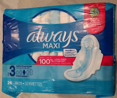 Always maxi size 3 extra long pads are super absorbent. I like using these at night especially since they are extra long. It is comfortable due to the shape. I like that each are individually wrapped so I can. throw a few in my purse.