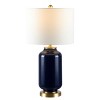 Illuminate your space with the stunning Amaia glass table lamp. Standing at 26.5 inches, this lamp features a striking navy glass body that seamlessly complements its sleek design. The composition combines 60 percent glass with a sturdy iron base and neck. This perfect blend of materials adds an element of sophistication to any room.