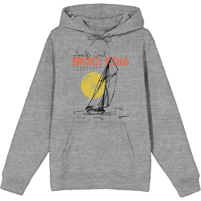 - Custom Design: Features detailed line art of a sailboat at sunset and bold text celebrating "Amalfi Coast Beach Club, Cliffside Sunsets" for a coastal vibe