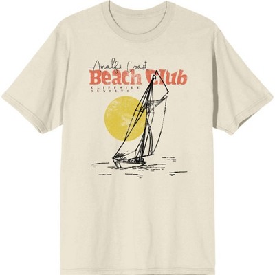 - Custom Design: Features detailed line art of a sailboat at sunset and bold text celebrating "Amalfi Coast Beach Club, Cliffside Sunsets" for a coastal vibe