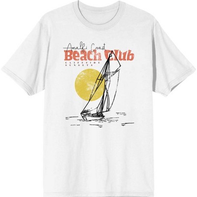 • Custom Design: Features detailed line art of a sailboat at sunset and bold text celebrating "Amalfi Coast Beach Club, Cliffside Sunsets" for a coastal vibe