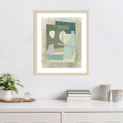 ART DESCRIPTION: The artwork features an abstract composition with overlapping geometric shapes in hues of turquoise, yellow, and grey. The intersecting lines and gradients create a dynamic pattern that draws the viewer's eye. This contemporary piece combines simplicity and complexity, making it a versatile addition to any space. This framed art print was created by Megan Meagher and printed by Amanti Art in Madison WI. The print is giclee printed using fade-resistant inks for picture-perfect detail and incredible depth of color and finished with a 100% real wood frame. Individually made using traditional custom framing techniques, it has the quality you would expect from your local frame shop.