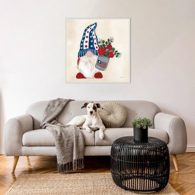 A depiction of a rooster standing on a post, its feathers painted with the pattern of the American flag. The background is a soft, pastoral countryside scene with fields and a distant tree line. The artwork exudes an air of patriotism with vibrant red, white, and blue colors symbolizing the flag of the United States. This piece offers a charming blend of rural life and national pride. This canvas art print was created by Wellington Studio and printed in Madison, WI. The canvas is stretched by hand and finished with a float frame. Individually made using traditional custom framing techniques, it has the quality you would expect from your local frame shop.