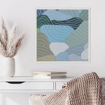This artwork depicts an abstract seascape featuring a collection of smoothly textured pebbles in the foreground, transitioning to an ocean with stylized waves in the background. The color palette consists of gentle pastels, creating a tranquil and serene atmosphere. The composition uses delicate linear patterns to add depth and movement to the piece. This canvas art print was created by Coco Good and printed in Waunakee, WI. The canvas is stretched by hand and finished with a float frame. Individually made using traditional custom framing techniques, it has the quality you would expect from your local frame shop.