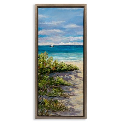 A tall red and white lighthouse stands prominently by the seaside, with gentle ocean waves crashing near the shore. Green foliage in the foreground adds to the serene coastal atmosphere, and the clear sky meets the distant horizon, creating a tranquil and picturesque landscape. This canvas art print was created by Shot by Clint and printed in Waunakee, WI. The canvas is stretched by hand and finished with a float frame. Individually made using traditional custom framing techniques, it has the quality you would expect from your local frame shop.