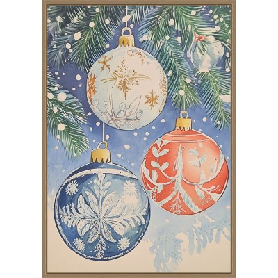 The image features a festive holiday design with three abstract Christmas ornaments hanging from a branch. The ornaments have an artistic, brushed style with colors including teal, white, peach, and dark blue. Golden starburst patterns decorate the dark blue background, adding an elegant festive touch to the overall design. This framed art print was created by Jennifer Paxton Parker and printed by Amanti Art in Madison WI. The print is giclee printed using fade-resistant inks for picture-perfect detail and incredible depth of color and finished with a 100% real wood frame. Individually made using traditional custom framing techniques, it has the quality you would expect from your local frame shop.