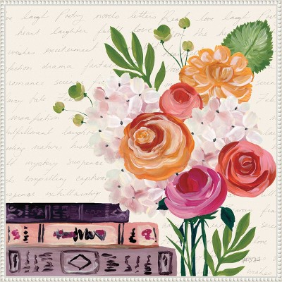 The artwork features a charming composition of pastel-colored flowers arranged alongside a stack of vintage books. The flowers, in shades of pink, coral, and white, lend a sense of elegance and nostalgia. Handwritten script in the background adds a literary touch to the scene. This canvas art print was created by Yvette St. Amant and printed in Waunakee, WI. The canvas is stretched by hand and finished with a float frame. Individually made using traditional custom framing techniques, it has the quality you would expect from your local frame shop.