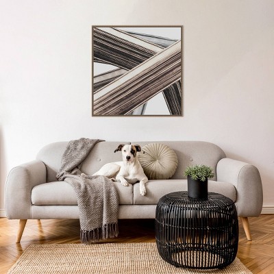 The artwork features intersecting white lines stretched across a textured neutral background. The composition creates a striking contrast and geometric pattern. Its minimalist design lends a contemporary and serene feel to the piece. This canvas art print was created by Jacob q and printed in Waunakee, WI. The canvas is stretched by hand and finished with a float frame. Individually made using traditional custom framing techniques, it has the quality you would expect from your local frame shop.