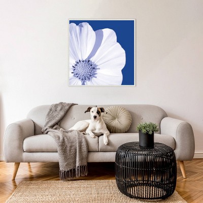 The image displays a close-up of a pristine white sand dollar set against a weathered, textured dark background. The intricate details of the sand dollar are highlighted, featuring its characteristic star-shaped pattern in the center. The juxtaposition of light and dark creates a striking visual appeal. This canvas art print was created by Marie Elaine Cusson and printed in Waunakee, WI. The canvas is stretched by hand and finished with a float frame. Individually made using traditional custom framing techniques, it has the quality you would expect from your local frame shop.