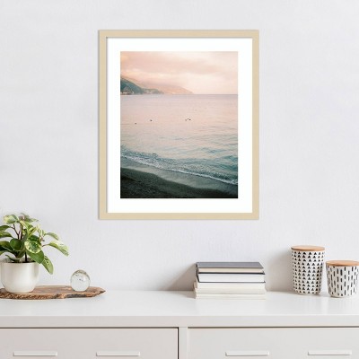 ART DESCRIPTION: This artwork features a tranquil coastal scene at sunset. Gentle waves meet the shore while soft pastel colors fill the sky and sea. Distant mountains fade into the horizon under calm, misty clouds. This framed art print was created by Justine Milton and printed by Amanti Art in Madison WI. The print is giclee printed using fade-resistant inks for picture-perfect detail and incredible depth of color and finished with a 100% real wood frame. Individually made using traditional custom framing techniques, it has the quality you would expect from your local frame shop.