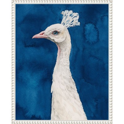 The artwork features a delicate watercolor portrait of a white peacock. The bird's side profile showcases its graceful neck and striking blue eye against a soft, neutral background. The subtle detail in the feathers adds depth and elegance to the piece. This canvas art print was created by Grace Popp and printed in Waunakee, WI. It is stretched across a solid surface to resist sagging. We use only premium, high-tension canvas. Our exclusive stretching techniques hide corner folds and provide a taut canvas surface. The artwork is authentically licensed. The canvas appears as if it is floating in the frame because it has a narrow gap between the edge of the canvas and the frame. Our canvas items are individually made using traditional custom framing techniques, it has the quality you would expect from your local frame shop.