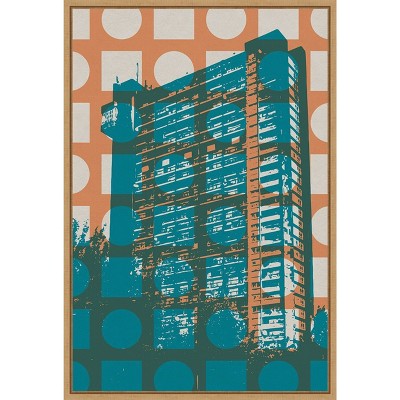 The artwork features a stylized representation of a Brutalist building with strong geometric shapes. The structure is depicted in blue tones against a neutral background with large arch-like forms. The composition emphasizes bold lines and abstract patterns, creating a modernist aesthetic. This canvas art print was created by Gary William and printed in Waunakee, WI. It is stretched across a solid surface to resist sagging. We use only premium, high-tension canvas. Our exclusive stretching techniques hide corner folds and provide a taut canvas surface. The artwork is authentically licensed. The canvas appears as if it is floating in the frame because it has a narrow gap between the edge of the canvas and the frame. Our canvas items are individually made using traditional custom framing techniques, it has the quality you would expect from your local frame shop.